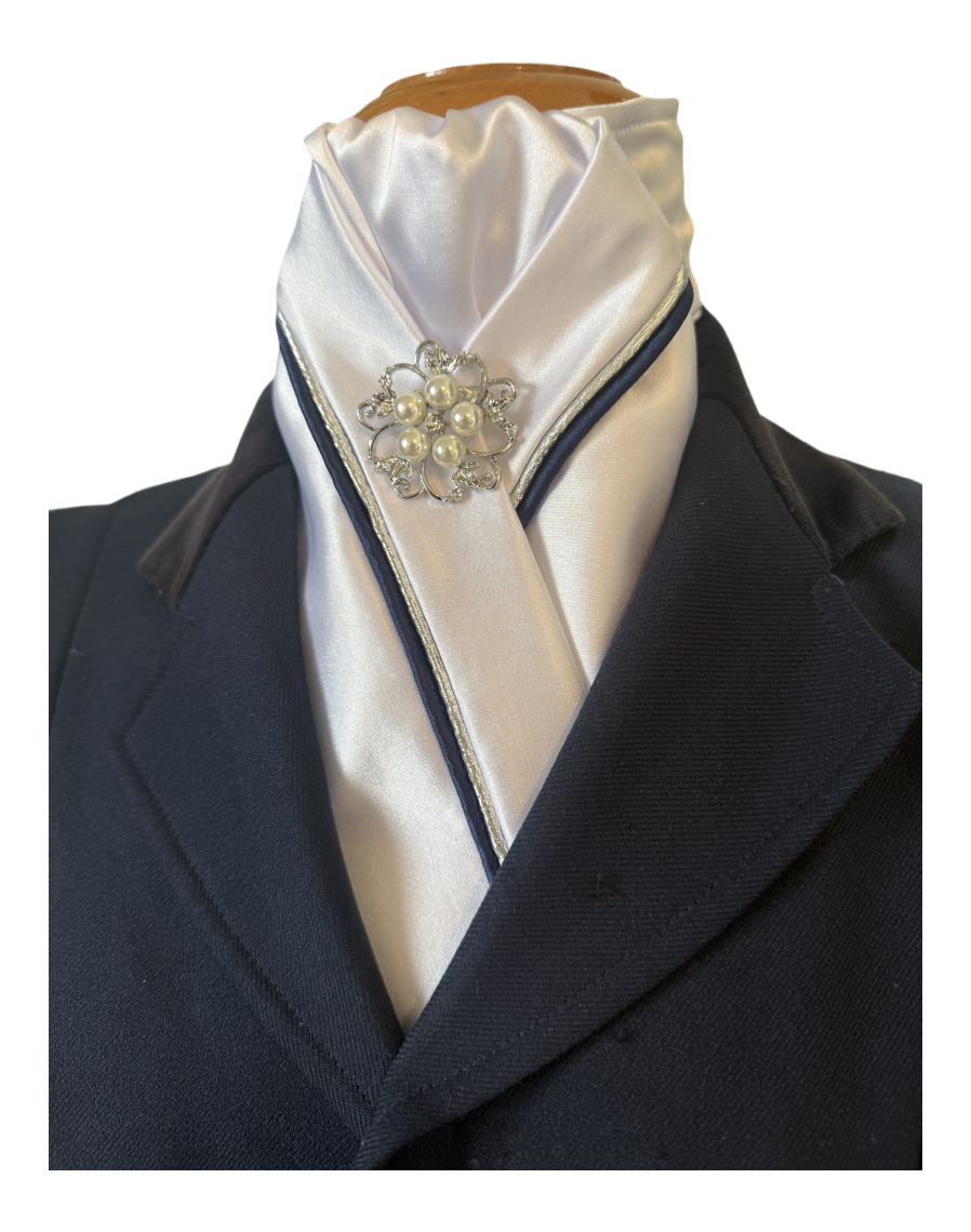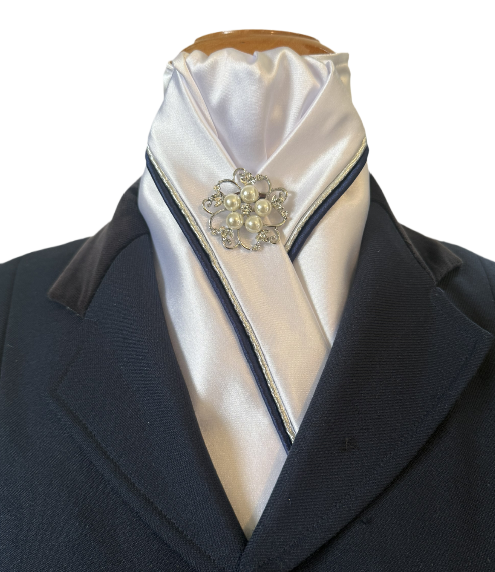 HHD Custom White Satin Pretied Dressage Stock Tie Silver & Navy Blue