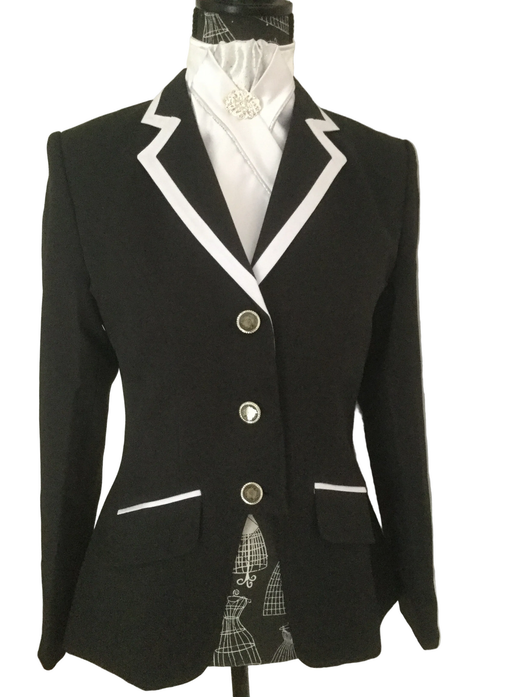 Jackets are fully lined, made with a lightweight wool blend fabric with a slight shine and available with either silver or gold button.
