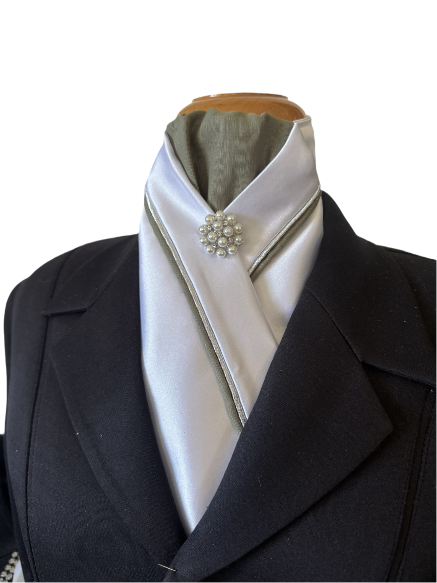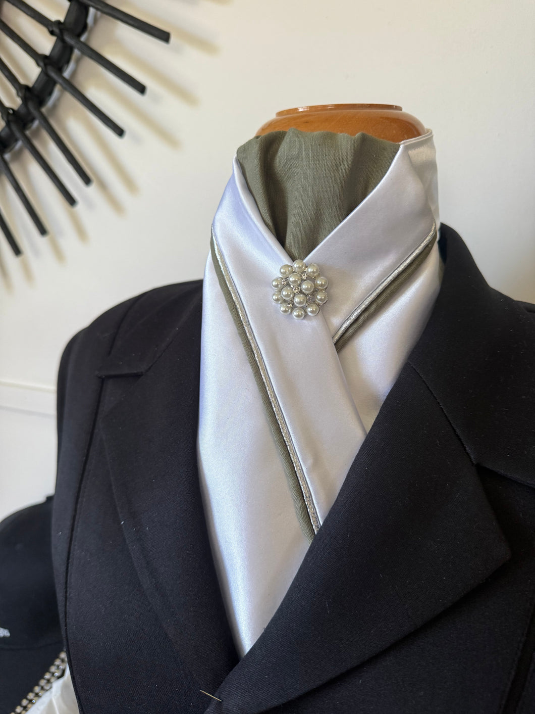 The HHD Custom Stock Tie in olive sage green and silver piping, silvertone pearl stock pin included